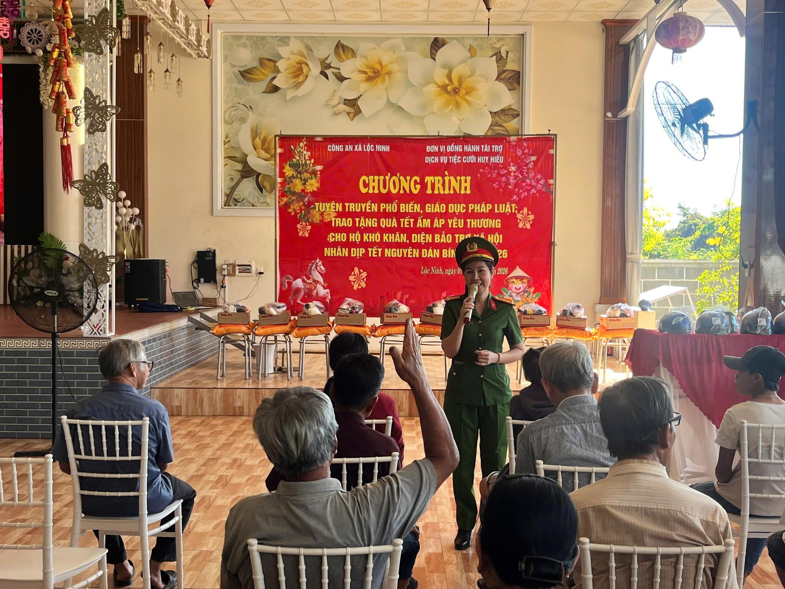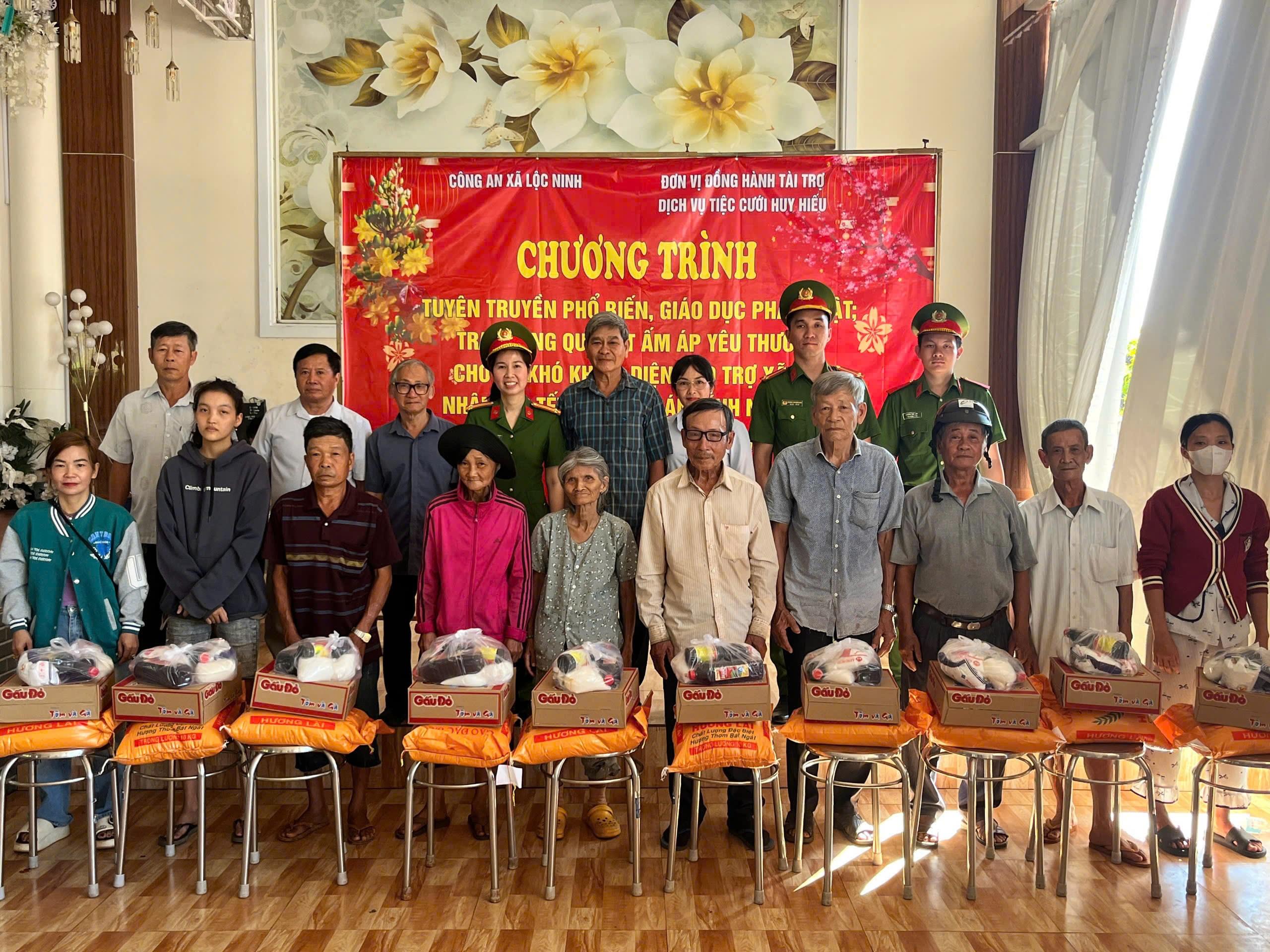 Dịp này, Công an xã Lộc Ninh đã vận động và phối hợp nhà hàng tiệc cưới Huy Hiếu tổ chức trao tặng hơn 150 phần quà tết, mỗi phần trị giá 500.00đ cho các hộ gia đình gồm nhu yếu phẩm phục vụ sinh hoạt trong bữa cơm hàng ngày của bà con, giúp các gia đình vơi bớt khó khăn, có thêm điều kiện vui Xuân, đón Tết đầm ấm. Những phần quà tuy giá trị không lớn nhưng chứa đựng sự quan tâm, sẻ chia và tinh thần trách nhiệm với cộng đồng.