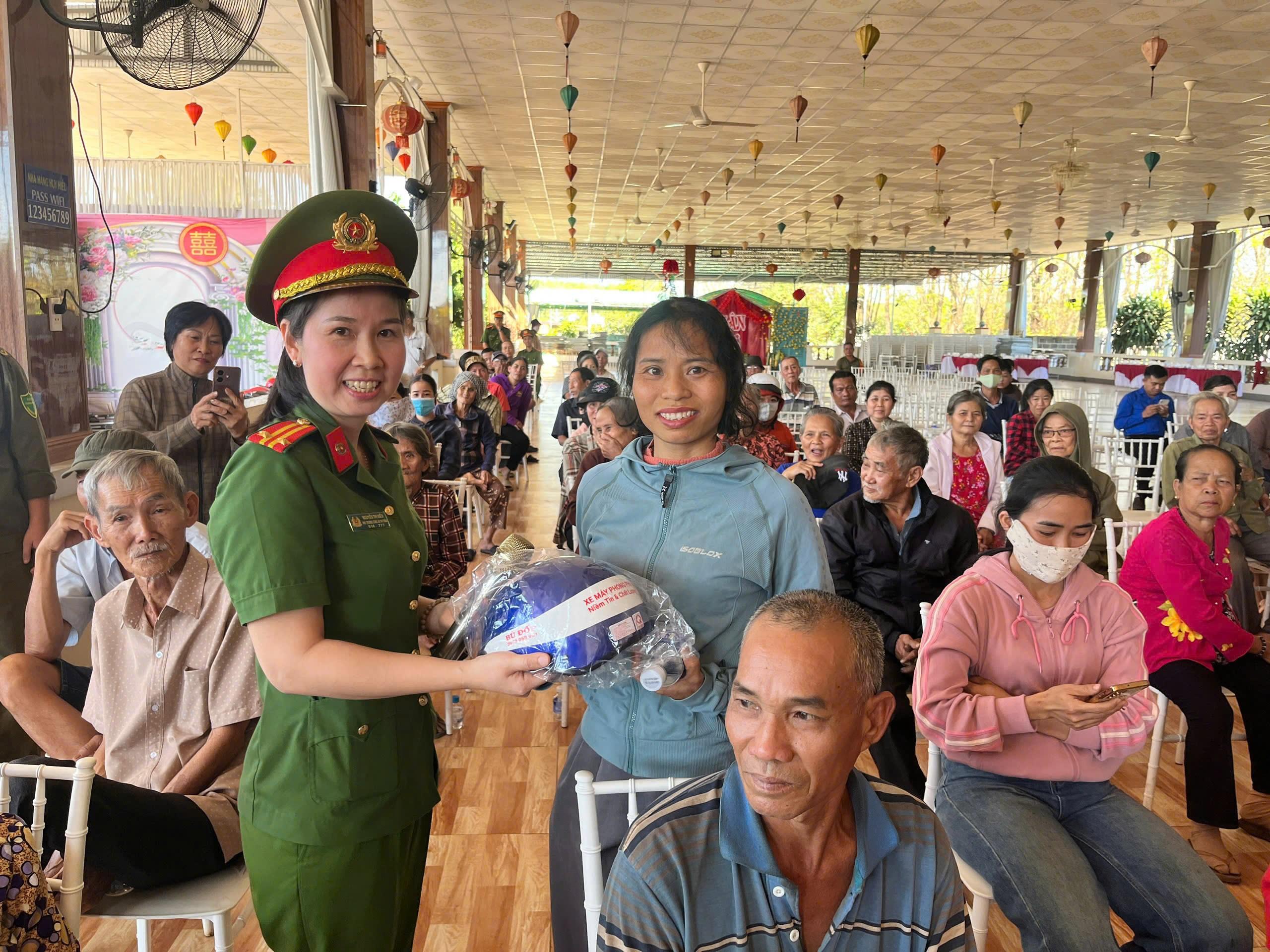 Cán bộ Công an xã tuyên truyền, phổ biến pháp luật và tặng mũ bảo hiểm