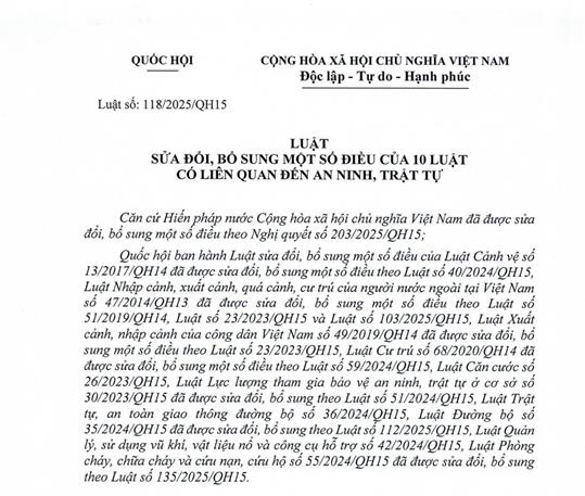 Ngày 10/12/2025, tại Kỳ họp Quốc hội khóa XV, Quốc hội đã thông qua Luật sửa đổi, bổ sung một số điều của 10 luật có liên quan đến an ninh, trật tự (Luật số 118/2025/QH15) với 89,85% đại biểu tán thành. Luật gồm 11 điều và sẽ chính thức có hiệu lực từ ngày 01/7/2026. Trong đó, có nhiều nội dung sửa đổi, bổ sung quan trọng liên quan đến Luật Xuất cảnh, nhập cảnh của công dân Việt Nam, góp phần hoàn thiện hành lang pháp lý, tạo thuận lợi cho người dân trong thực hiện các thủ tục hành chính.