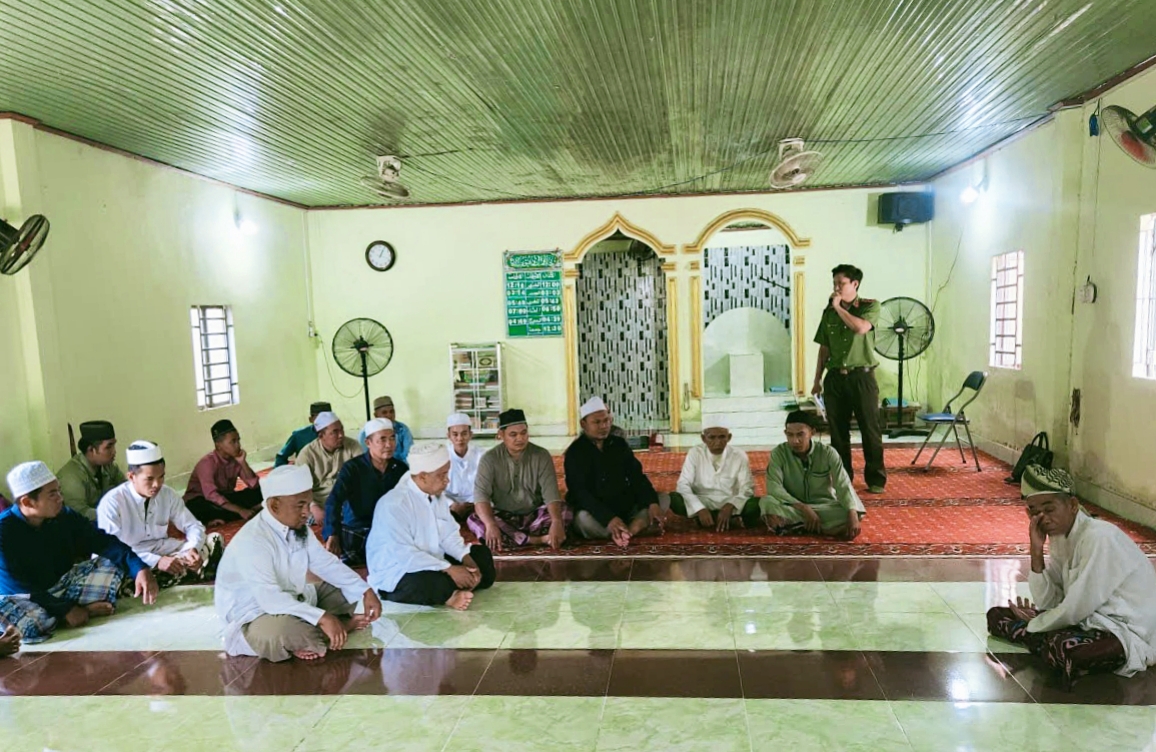 Cán bộ, chiến sĩ Công an xã trao đổi thông tin và tuyên truyền về ý nghĩa, tầm quan trọng của cuộc bầu cử tại Tiểu Thánh đường Nu Rum Islam Hồi giáo