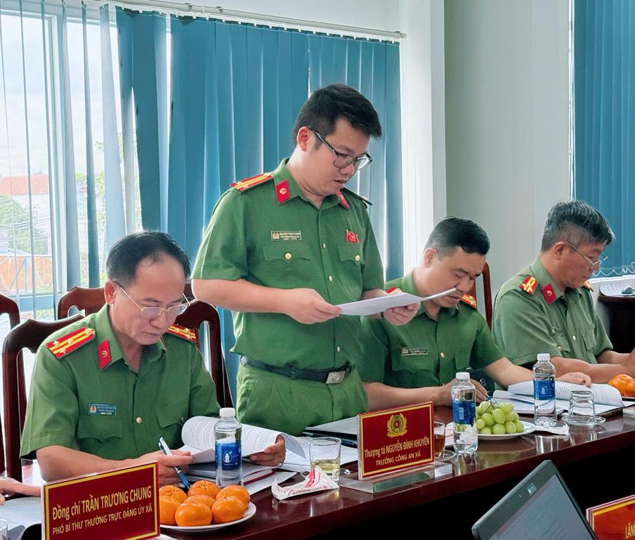 Đồng chí Trung tá Nguyễn Trần Thanh, Phó Trưởng Công an xã báo cáo kết quả triển khai thực hiện Nghị quyết số 09