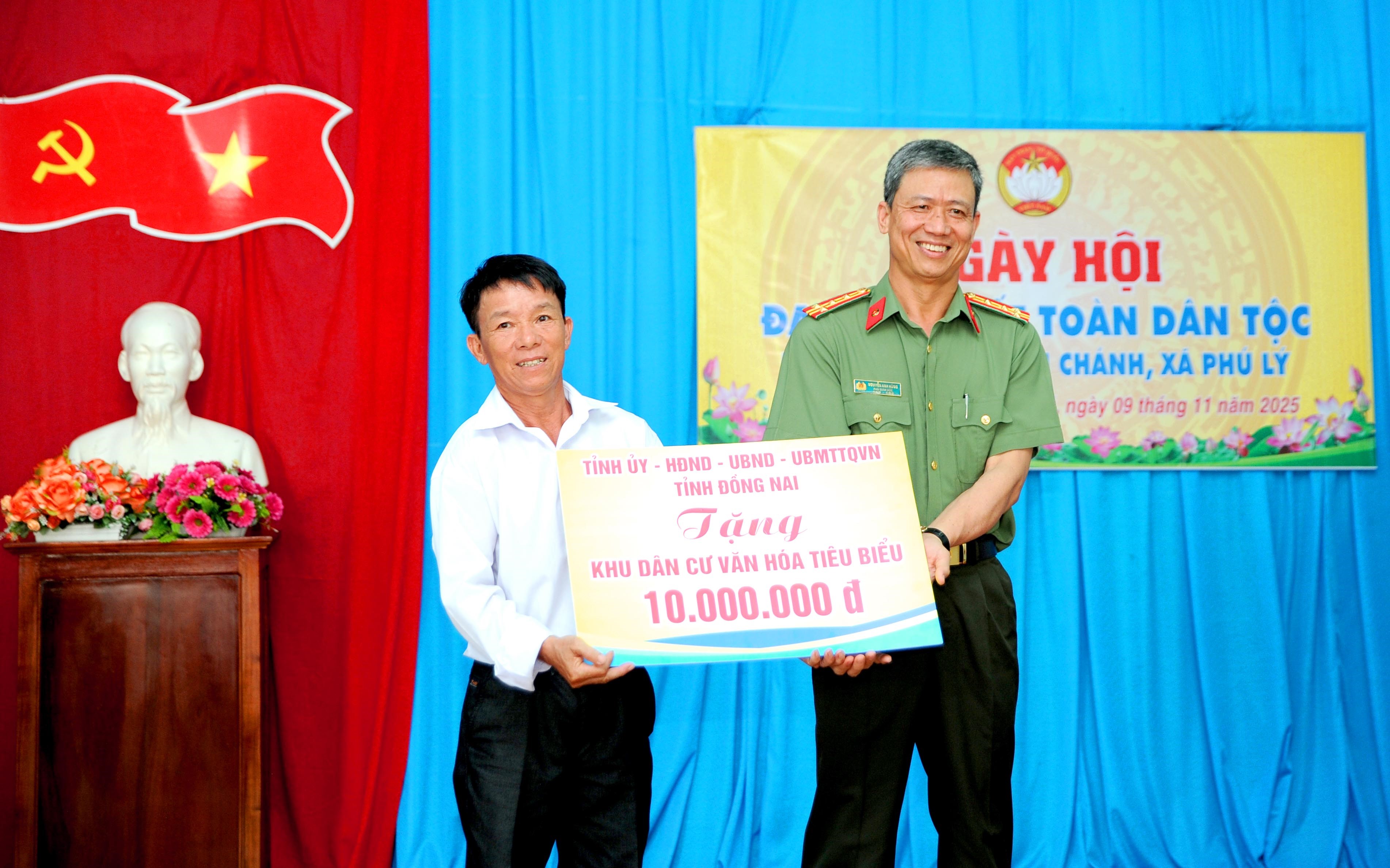 Thay mặt lãnh đạo tỉnh về dự Ngày hội Đại đoàn kết toàn dân tộc với Nhân dân ấp Bình Chánh, đồng chí Đại tá Nguyễn Anh Hùng, Phó Giám đốc Công an tỉnh đã trao món quà 10 triệu đồng của Tỉnh ủy, HĐND, UBND, UBMTTQVN tỉnh Đồng Nai tặng cho ấp Bình Chánh là “Khu dân cư văn hóa tiêu biểu” và trao 5 phần quà, mỗi phần trị giá 1 triệu đồng cho 5 hộ gia đình văn hóa tiêu biểu của ấp. Chính quyền xã Phú Lý, ấp Bình Chánh cũng có nhiều phần quà cùng học bổng, trao tặng các hộ gia đình khó khăn và học sinh vượt khó, học giỏi.