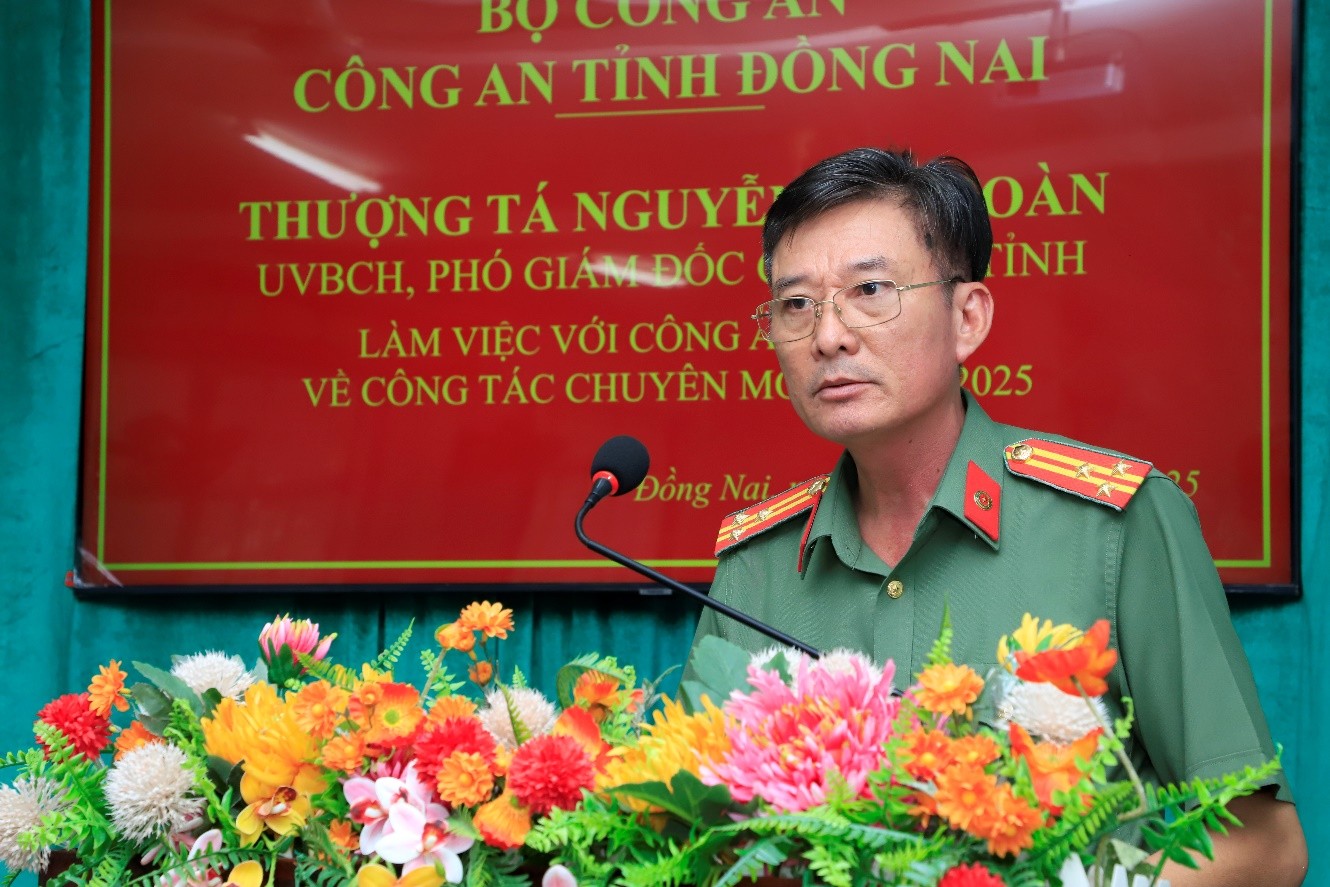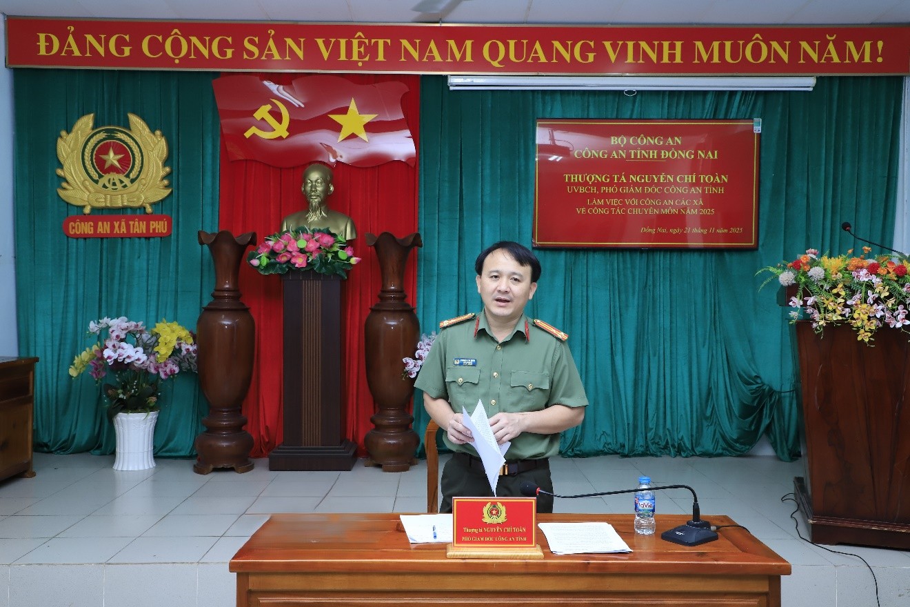 Ngày 21/11, tại Công an xã Tân Phú, Đoàn công tác Công an tỉnh Đồng Nai do Thượng tá Nguyễn Chí Toàn, Phó Giám đốc Công an tỉnh làm trưởng đoàn đã kiểm tra công tác quản lý người nước ngoài (NNN) và công tác vận hành chính quyền địa phương 2 cấp trên địa bàn các xã: Tân Phú, Tà Lài, Nam Cát Tiên, Phú Lâm, Đắk Lua, Định Quán, La Ngà, Thanh Sơn, Phú Vinh, Phú Hoà, tỉnh Đồng Nai. Tham gia đoàn công tác có đại diện lãnh đạo các phòng nghiệp vụ Công an tỉnh.  Đồng chí Phó Giám đốc Công an tỉnh phát biểu chỉ đạo Đồng chí Phó Giám đốc Công an tỉnh phát biểu chỉ đạo