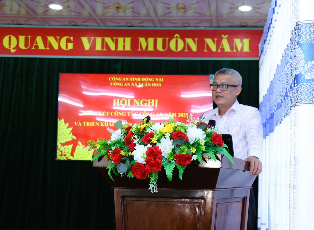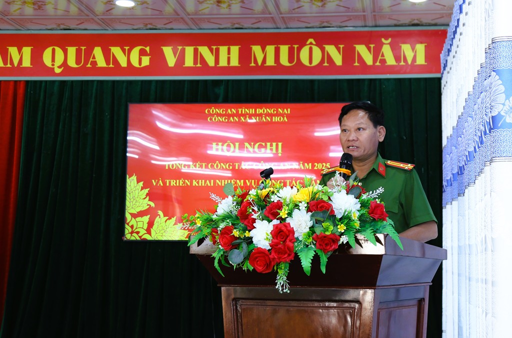 Phát biểu chỉ đạo tại Hội nghị, Đại tá Nguyễn Anh Hùng, Phó Giám đốc Công an tỉnh Đồng Nai, đồng chí Tạ Quang Trường, Bí thư Đảng ủy xã ghi nhận, biểu dương những nỗ lực, thành tích mà Công an xã Xuân Hòa đã đạt được trong năm qua; đồng thời yêu cầu đơn vị tiếp tục phát huy tinh thần trách nhiệm, chủ động nắm chắc tình hình, triển khai hiệu quả các biện pháp nghiệp vụ, tiếp tục nâng cao tinh thần trách nhiệm, siết chặt kỷ luật, kỷ cương; đẩy mạnh ứng dụng công nghệ thông tin trong quản lý dân cư và phòng, chống tội phạm, nhất là tội phạm sử dụng công nghệ cao; phấn đấu kéo giảm tội phạm, giữ vững đoàn kết nội bộ, hoàn thành tốt các chỉ tiêu công tác được giao góp phần giữ vững ổn định an ninh chính trị, trật tự an toàn xã hội, phục vụ tốt nhiệm vụ phát triển kinh tế – xã hội của địa phương trong năm 2026 trong đó tập trung bảo vệ tuyệt đối an ninh, an toàn Tết Nguyên đán Bính Ngọ 2026, Đại hội đại biểu toàn quốc lần thứ XIV của Đảng và cuộc bầu cử đại biểu Quốc hội khóa XVI, Hội đồng nhân dân các cấp nhiệm kỳ 2026–2031.