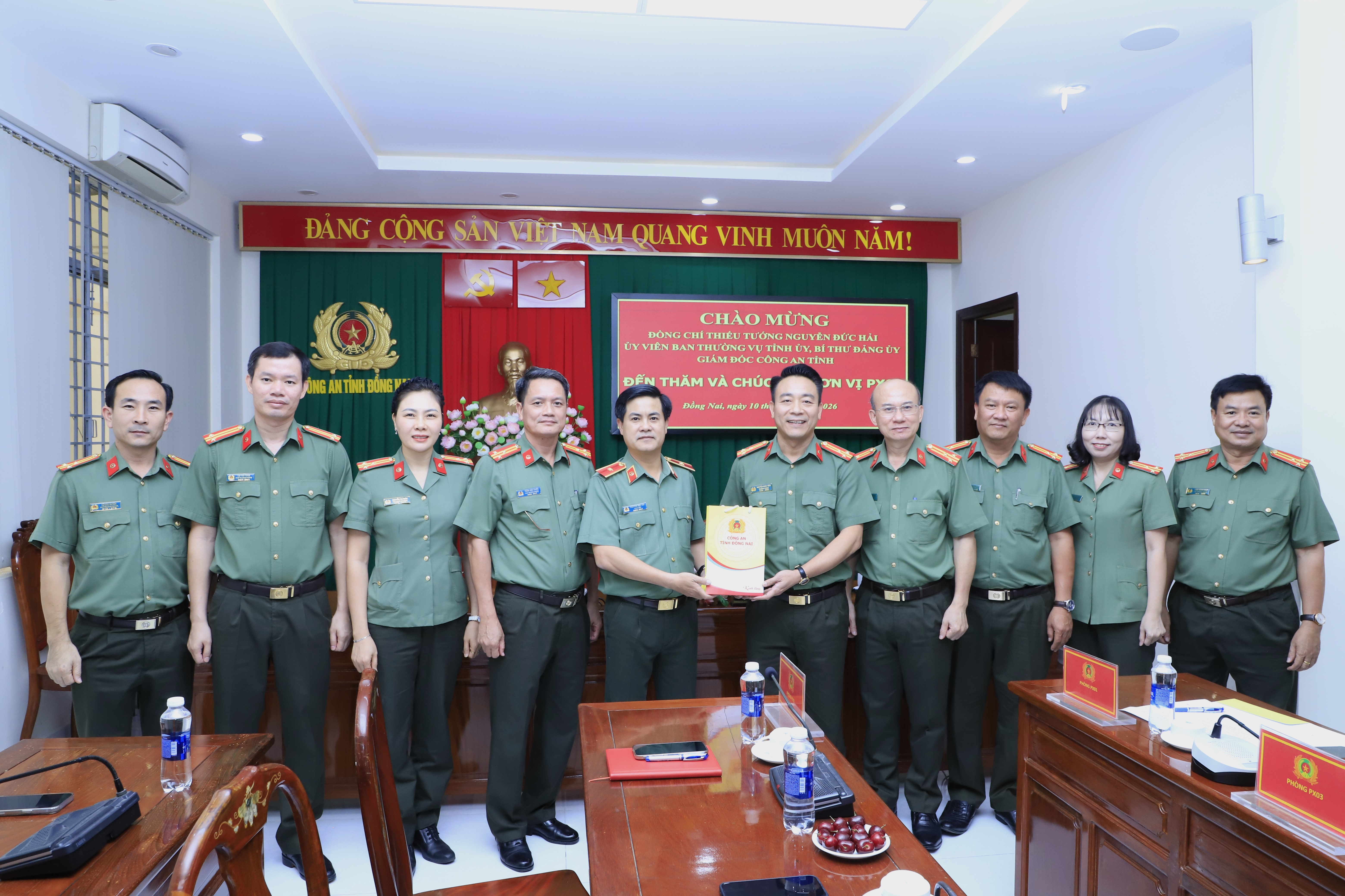 Tới thăm và chúc Tết Phòng Tổ chức Cán bộ, đồng chí Giám đốc Công an tỉnh ghi nhận, biểu dương đơn vị được Bộ Công an trao tặng danh hiệu dẫn đầu phong trào thi đua Vì ANTQ năm 2025. Đồng thời lưu ý, công tác cán bộ là gốc của mọi công việc, tổ chức cán bộ phải nhân văn, bố trí cán bộ cần quan tâm đến hoàn cảnh, năng lực, sở trường, công tác, thấu lý, đạt tình, lấy hiệu quả công việc là quan trọng nhất. Đề nghị trong năm 2026, đơn vị cần cố gắng, nỗ lực nhiều hơn nữa, nhanh hơn, ứng dụng tốt khoa học công nghệ vào quản lý cán bộ. Năm 2025 công tác tổ chức cán bộ rất nhiều việc và đã làm tốt, năm 2026 càng phải tốt hơn nữa, chỉnh chu hơn nữa, đội ngũ cán bộ phải ngày càng tinh nhuệ, sử dụng đúng người, đúng việc, đúng chỗ. Đơn vị phải là cánh tay đắc lực tham mưu với Ban Giám đốc Công an tỉnh lãnh đạo, chỉ đạo, bố trí cán bộ nhuần nhuyễn, nhịp nhàng. Chúc lãnh đạo, chỉ huy, CBCS đơn vị luôn đoàn kết thực hiện thắng lợi mọi nhiệm vụ được giao, gia đình luôn mạnh khoẻ, hạnh phúc, đón Xuân vui vẻ.