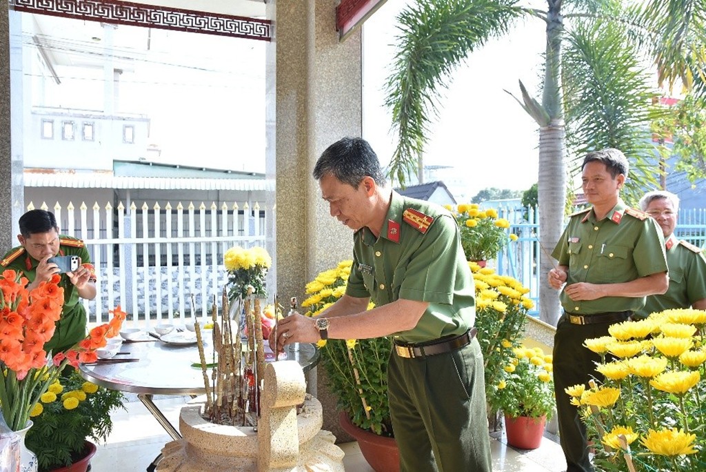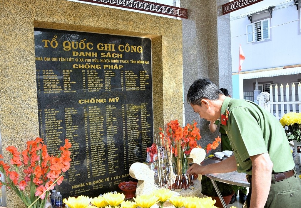 Đại tá Nguyễn Anh Hùng thắp hương tri ân, tưởng nhớ công ơn các anh hùng, liệt sĩ tại bia tưởng niệm trong khuôn viên Công an xã Đại Phước