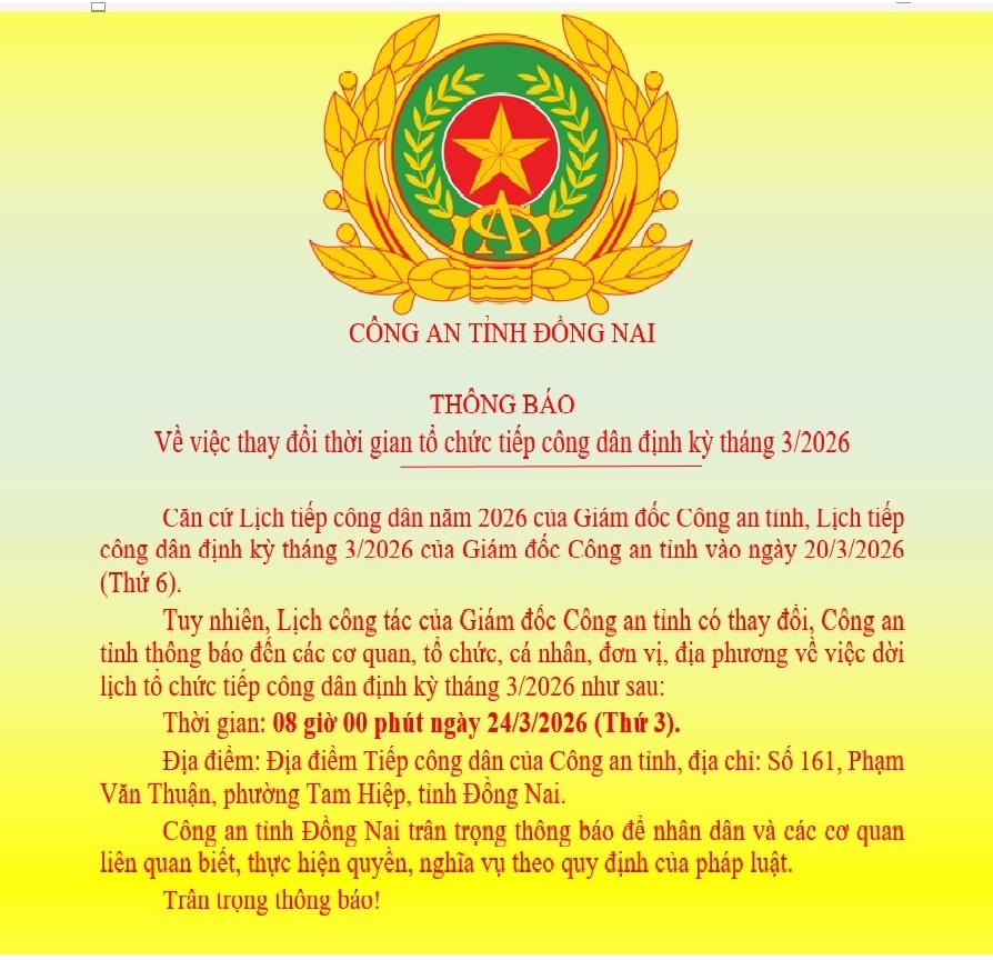 Công an tỉnh Đồng Nai trân trọng thông báo việc thay đổi thời gian tiếp Công dân định kỳ tháng 3 năm 2026 của Giám đốc Công an tỉnh như sau: