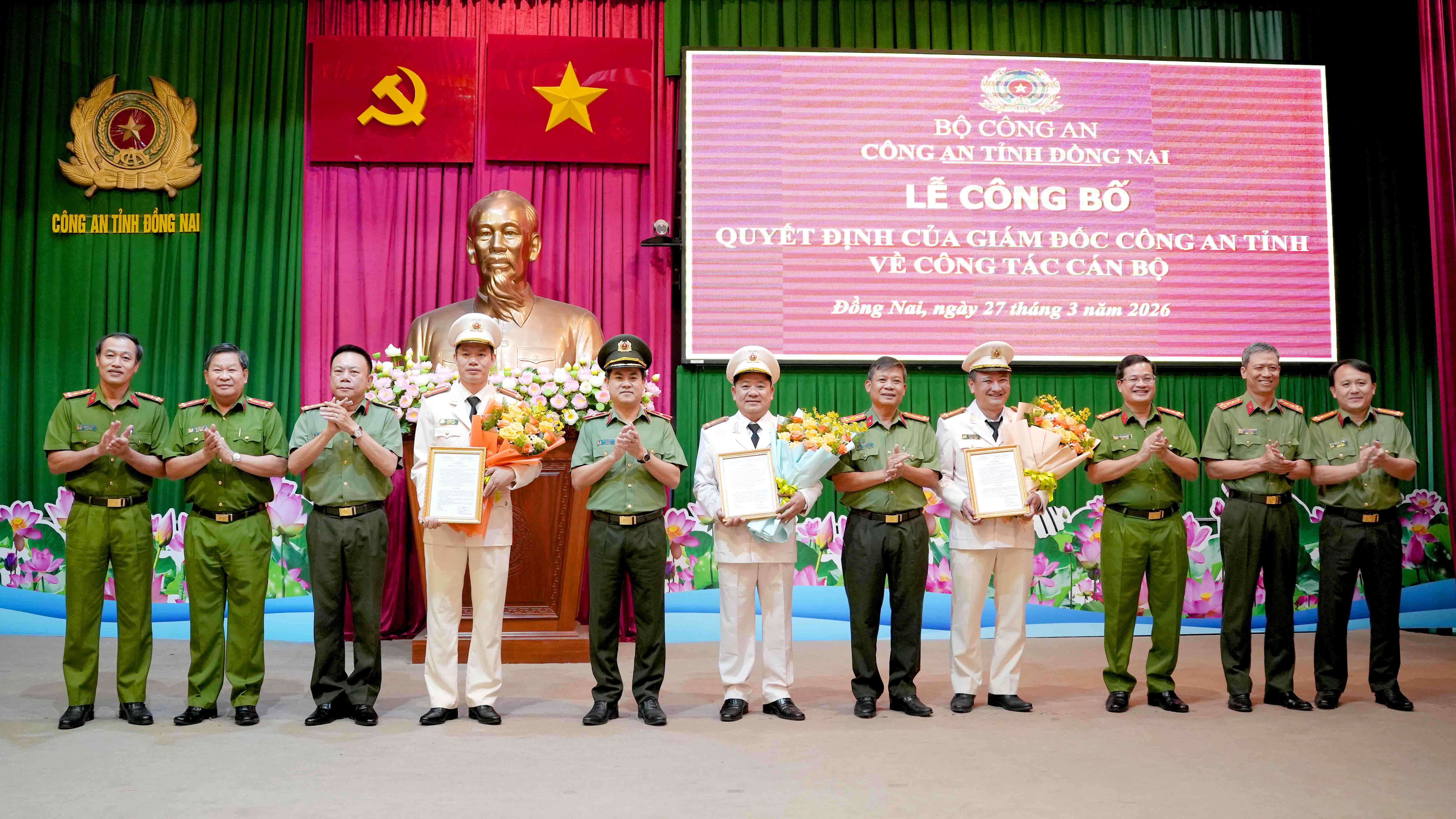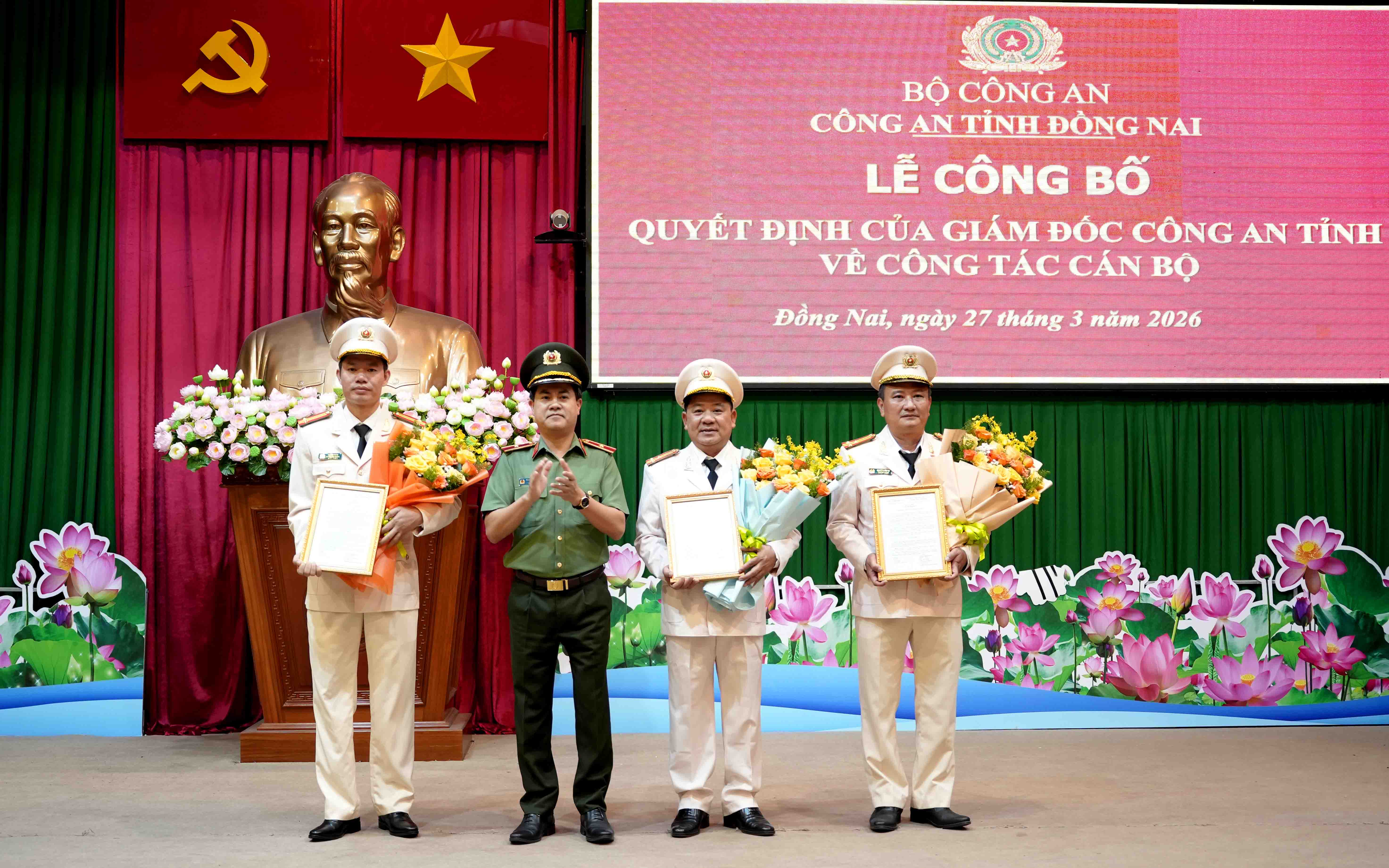 Thiếu tướng Nguyễn Đức Hải, Ủy viên Ban Thường vụ Tỉnh ủy, Bí thư Đảng ủy, Giám đốc Công an tỉnh trao quyết định cho 3 đồng chí.