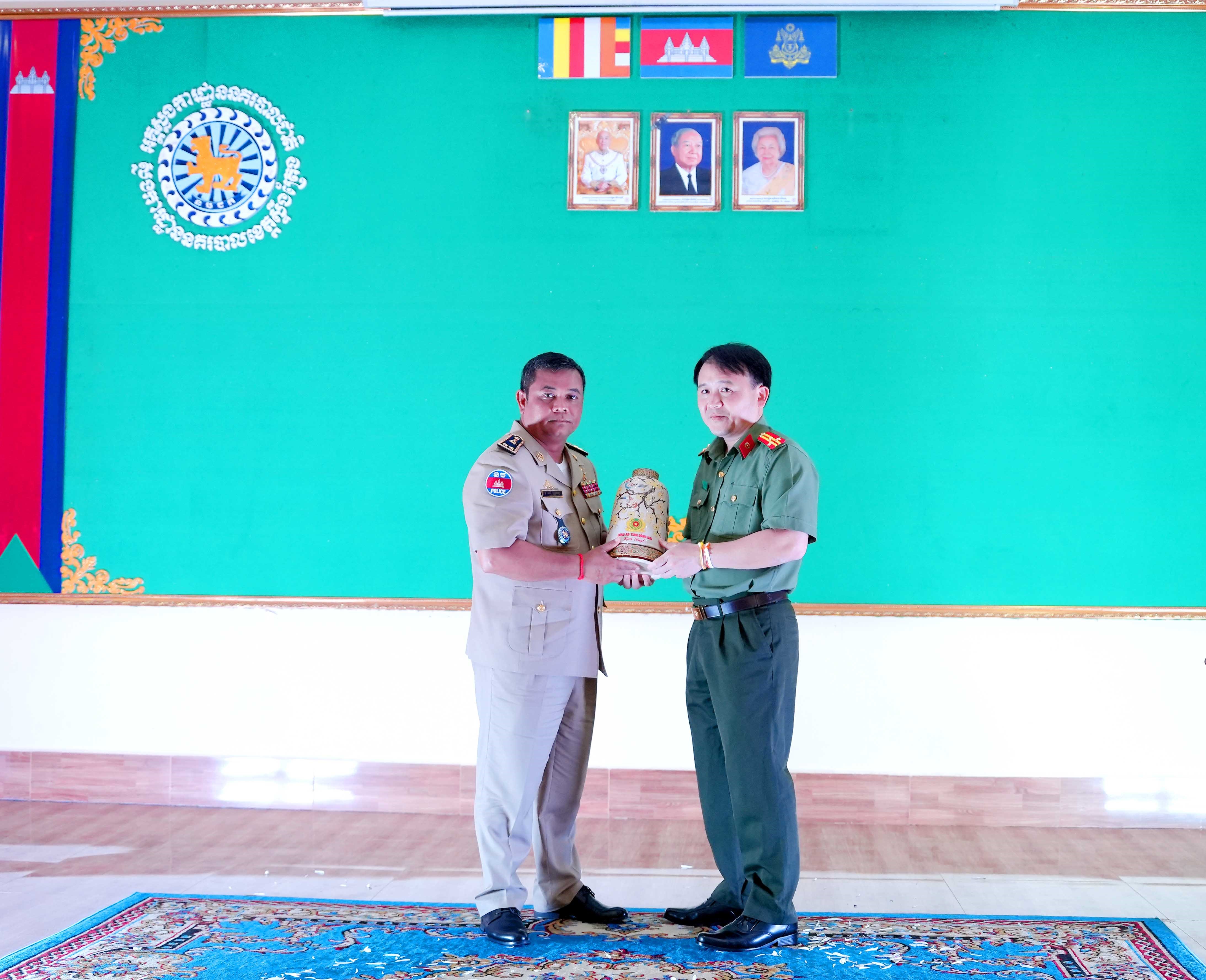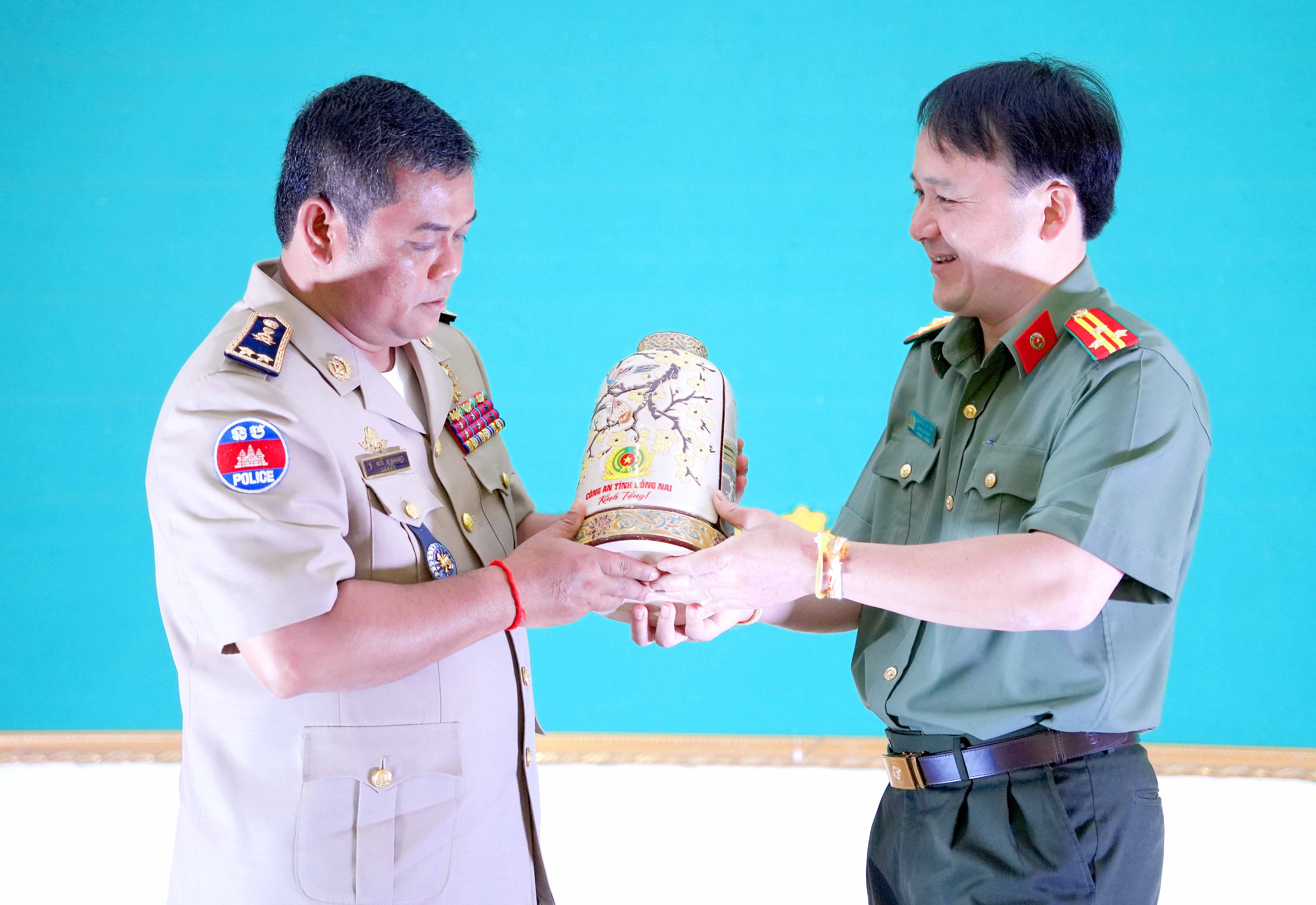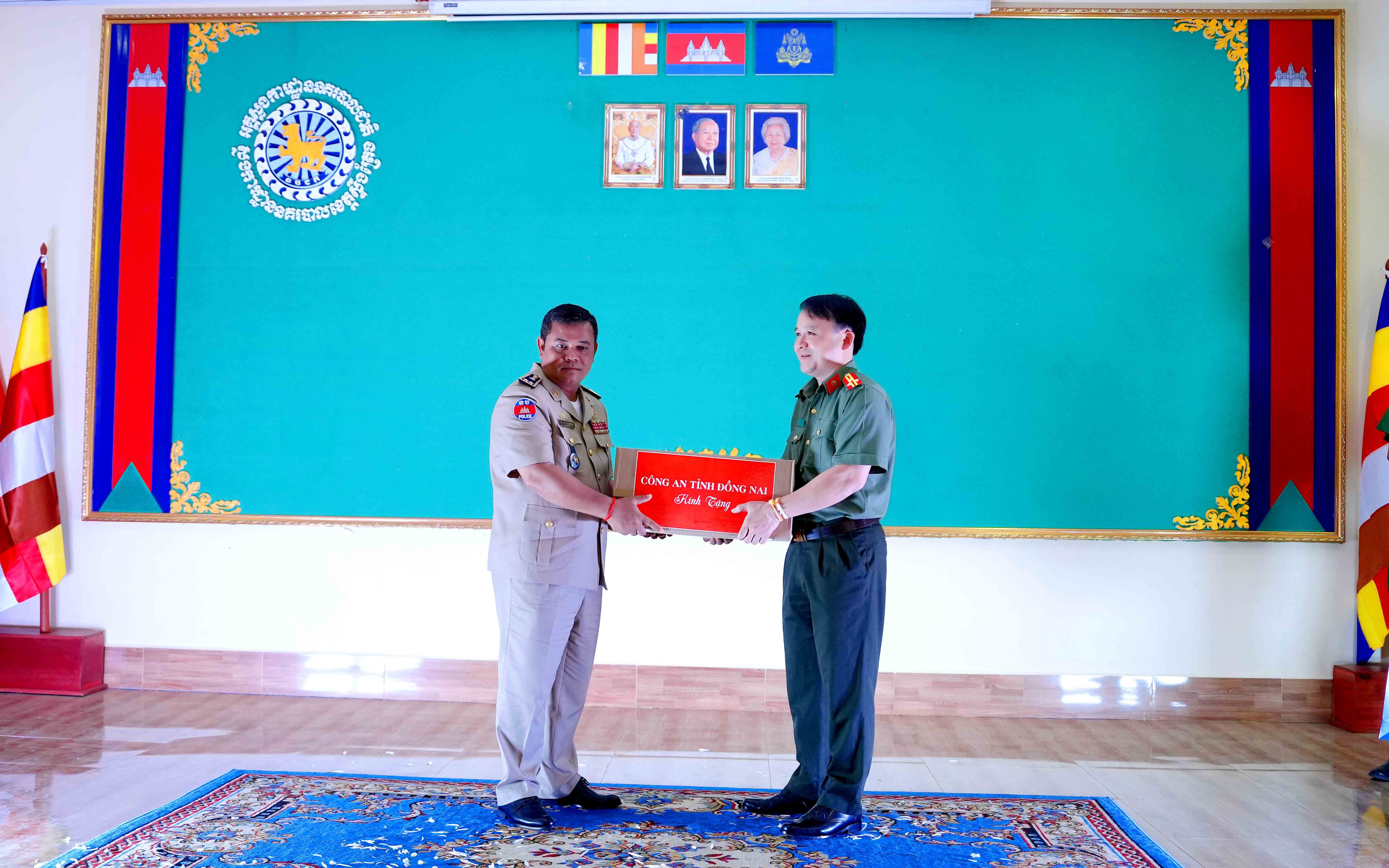 Thượng tá Nguyễn Chí Toàn, Phó Giám đốc Công an tỉnh Đồng Nai tặng quà lưu niệm cho Ty Công an Stung Treng.