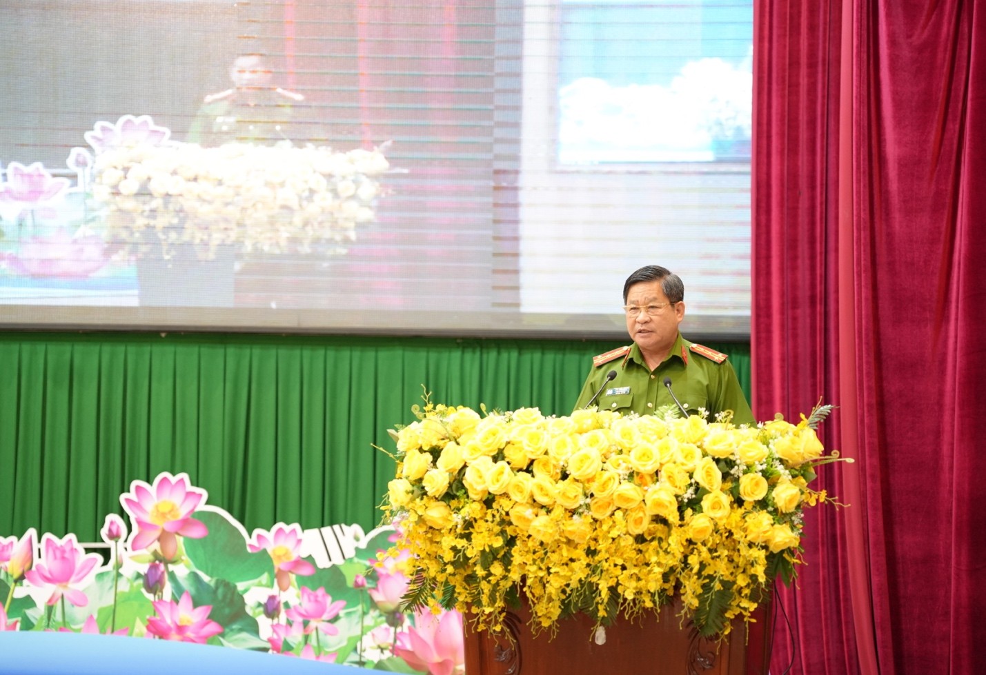 Đại tá Lâm Văn Long, Phó Giám đốc Công an tỉnh phát biểu tham luận tại Hội nghị