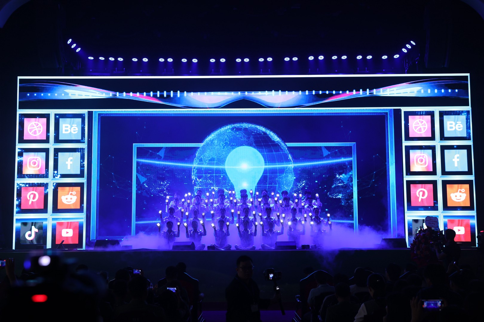 Các đại biểu thực hiện nghi thức nhấn nút khai mạc cuộc thi.