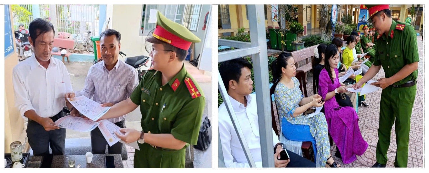 Công an xã tuyên truyền và kết hợp phát tờ rơi tuyên truyền