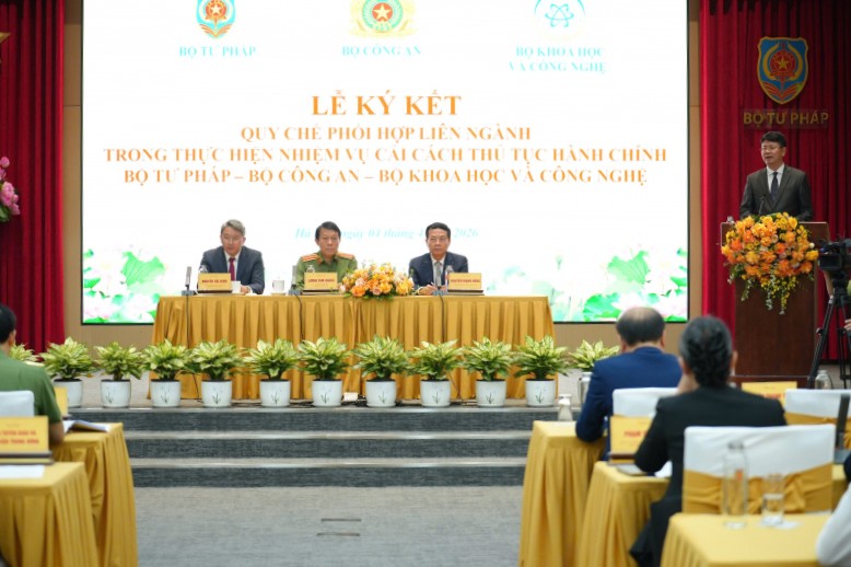 Tại buổi lễ, trước sự chứng kiến của các đại biểu, Bộ trưởng Bộ Công an Lương Tam Quang, Bộ trưởng Bộ Tư pháp Nguyễn Hải Ninh và Bộ trưởng Bộ Khoa học và Công nghệ Nguyễn Mạnh Hùng đã ký kết Quy chế phối hợp liên ngành trong thực hiện nhiệm vụ cải cách TTHC.