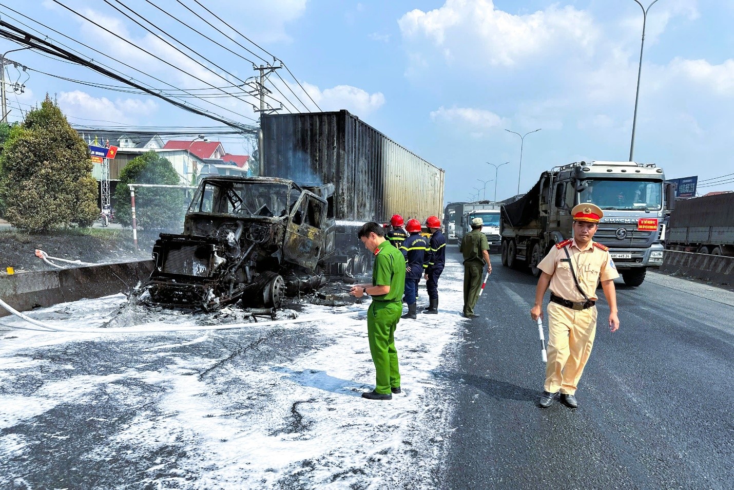 Cảnh sát giao thông kịp thời phân luồng, bảo đảm an toàn giao thông khi ô tô đầu kéo bốc cháy trên Quốc lộ 51