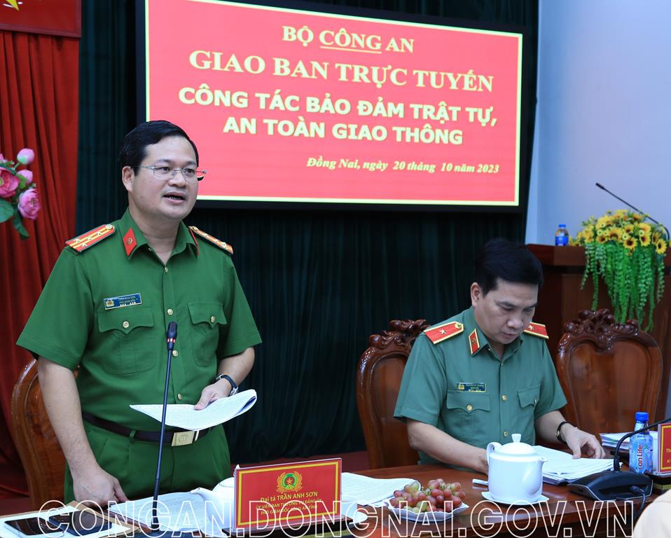 Đồng chí Đại tá Trần Anh Sơn, Phó giám đốc Công an tỉnh phát biểu tham luận tại hội nghị giao ban trực tuyến.