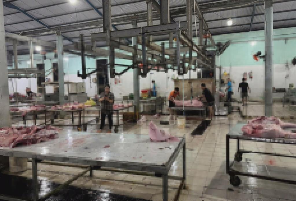 Theo đó, rạng sáng ngày 02/10, Phòng An ninh kinh tế Công an tỉnh phối hợp với Chi cục Chăn nuôi và Thủy sản tỉnh Đồng Nai, Công an xã Đại Phước và Phước An kiểm tra hành chính cơ sở giết mổ heo do ông N.M.V. (46 tuổi, ngụ xã Đại Phước) và cơ sở do ông P.V.H (45 tuổi, ngụ xã Phước An) làm chủ, phát hiện các cơ sở đang giết mổ heo nhưng không thực hiện các quy định về điều kiện bảo đảm an toàn thực phẩm trong sản xuất, kinh doanh, bảo quản thực phẩm. Một số công nhân làm việc không được trang bị đồ bảo hộ lao động trong khu giết mổ heo theo quy định.