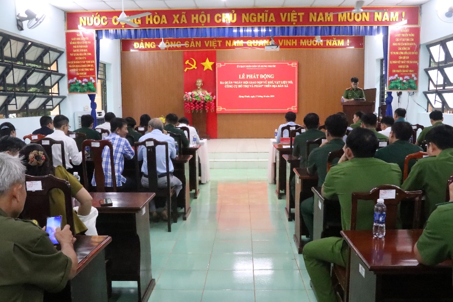 Tại buổi lễ đại diện lãnh đạo Ủy ban nhân dân xã đã phát động đến toàn thể cán bộ, đảng viên, công chức, viên chức và các tầng lớp nhân dân tích cực tham gia tố giác các hành vi, vi phạm pháp luật nói chung đặc biệt là hành vi chế tạo sản xuất mua bán vận chuyển tàng trữ sử dụng trái phép vũ khí vật liệu nổ công cụ hỗ trợ và pháo nổ.