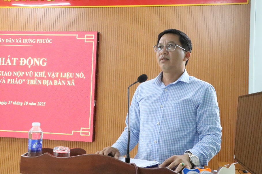 Tại xã Hưng Phước, Công an xã vừa tham mưu UBND xã tổ chức Lễ ra quân "Ngày hội giao nộp vũ khí vật liệu nổ công cụ hỗ trợ và pháo nổ" trên địa bàn xã. Dự hội nghị có đồng chí Trịnh Tiến Tâm - Bí thư Đảng ủy, Chủ tịch HĐND xã cùng lãnh đạo Đảng ủy - HĐND - UBND xã; Ban chỉ huy Công an xã cùng lãnh đạo các phòng ban và các đơn vị liên quan.