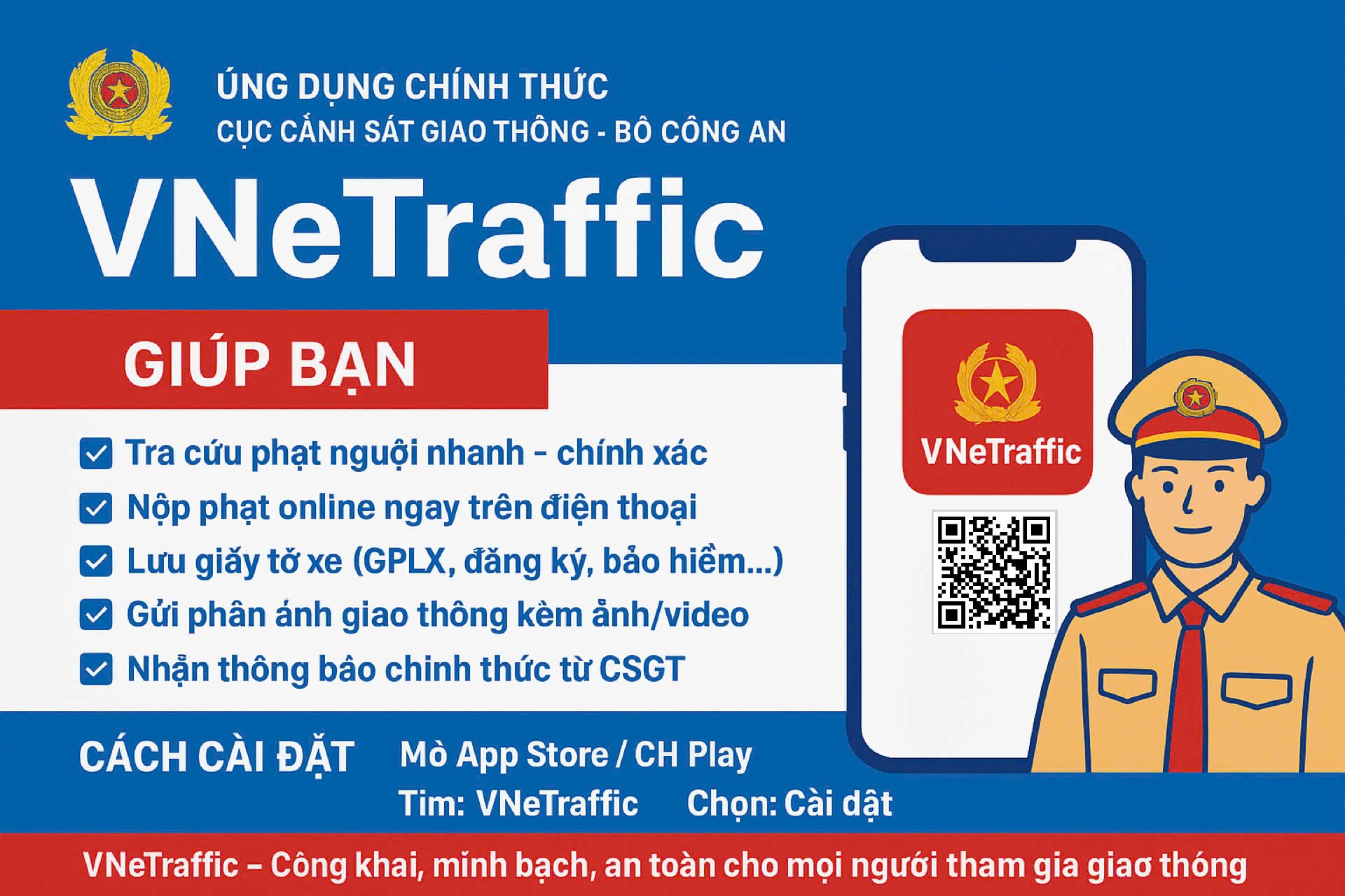 VNeTraffic là ứng dụng di động của Bộ Công an Việt Nam, được thiết kế để hỗ trợ người dân trong việc quản lý các vấn đề liên quan đến giao thông, góp phần giảm thủ tục hành chính, hạn chế việc sử dụng giấy tờ bản cứng truyền thống. Ứng dụng này giúp tăng cường sự minh bạch, tiện lợi và cải thiện trải nghiệm của người dùng trong việc tra cứu các thông tin về vi phạm giao thông, cũng như các thủ tục liên quan.