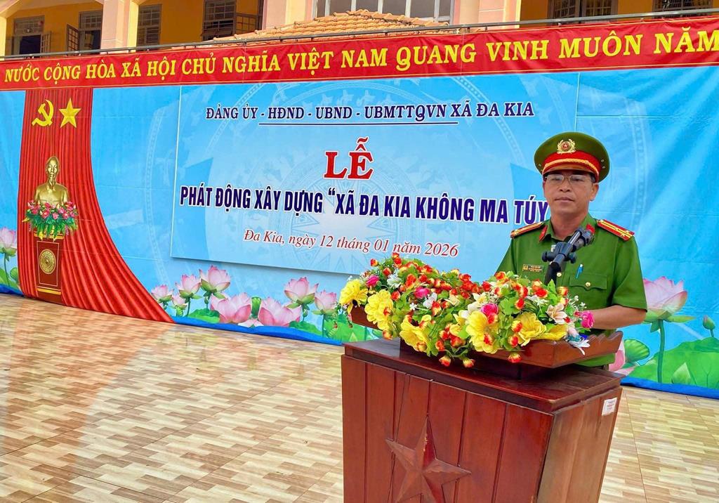 Phát biểu tại buổi Lễ, đồng chí Trưởng Công an xã Đa Kia nhấn mạnh: Ma túy là hiểm họa lớn của nhân loại, là nguyên nhân phát sinh nhiều loại tội phạm, gây ảnh hưởng nghiêm trọng đến sức khỏe con người, trật tự, an toàn xã hội và sự phát triển bền vững của địa phương. Đồng chí khẳng định việc phát động phong trào “Xây dựng địa bàn Đa Kia không ma túy” là nhiệm vụ trọng tâm, có ý nghĩa quan trọng nhằm bảo vệ cuộc sống bình yên của Nhân dân và tương lai thế hệ trẻ. Đồng thời, đề nghị cán bộ, đảng viên và Nhân dân, cơ sở giáo dục nâng cao nhận thức, phát huy tinh thần đoàn kết toàn dân, tích cực tham gia phòng, chống ma túy, kịp thời phát hiện, tố giác tội phạm và chung tay hỗ trợ người lầm lỡ cai nghiện, tái hòa nhập cộng đồng.