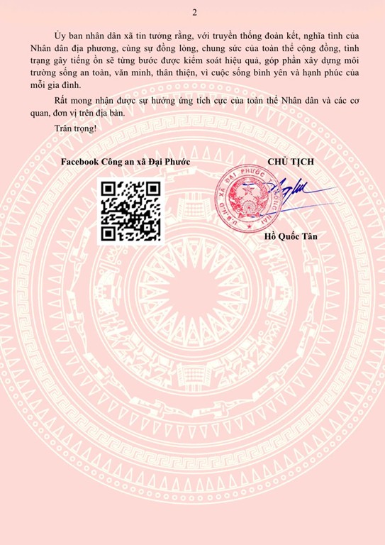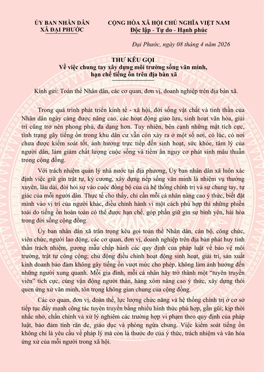 Công an xã Đại Phước (tỉnh Đồng Nai) đã chủ động tham mưu Ủy ban nhân dân xã ban hành Thư kêu gọi chung tay xây dựng môi trường sống văn minh, hạn chế tiếng ồn trên địa bàn.