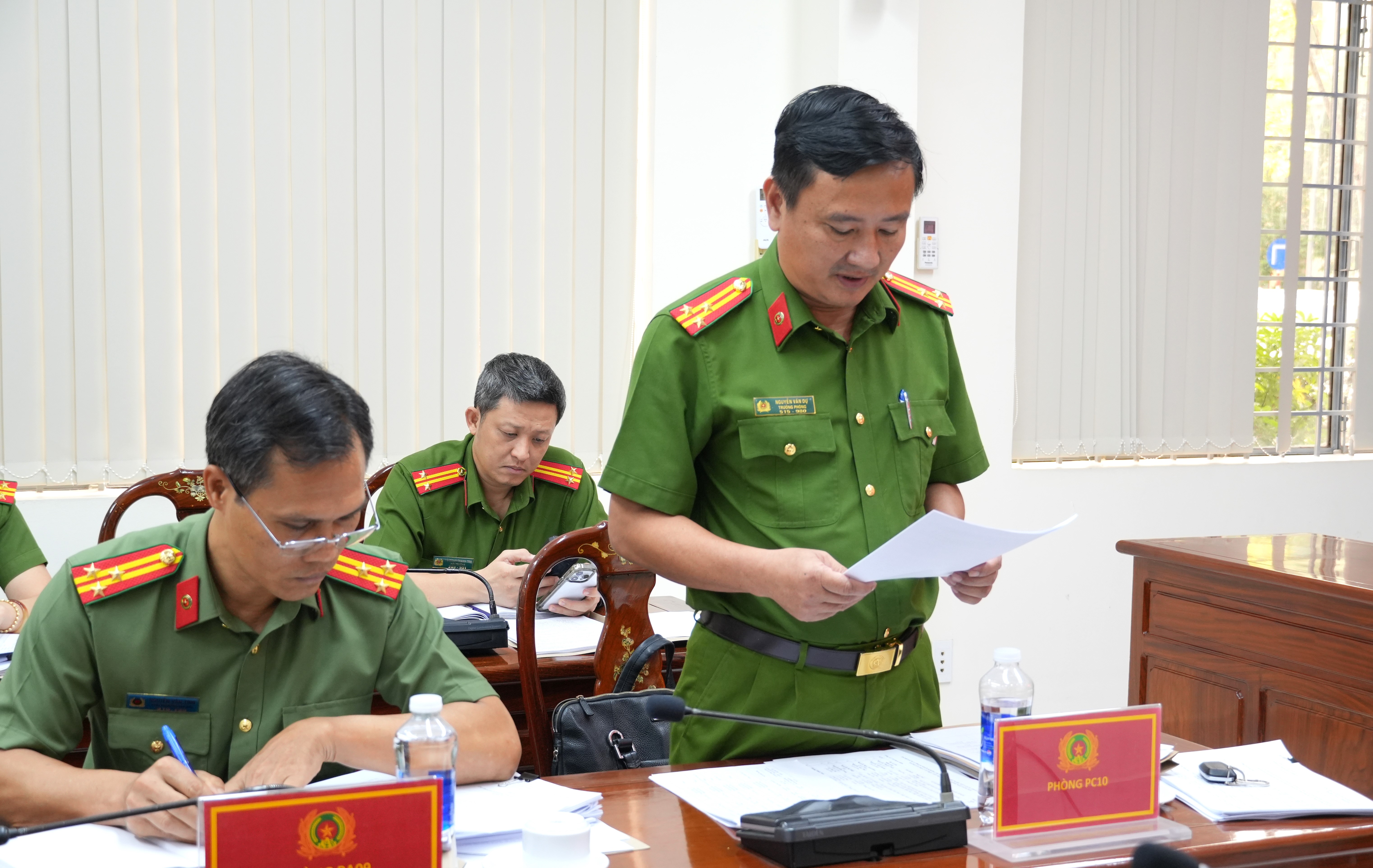 Đồng chí Thượng tá Nguyễn Văn Dự - Trưởng phòng THAHS và HTTP Công an tỉnh báo cáo tại cuộc họp