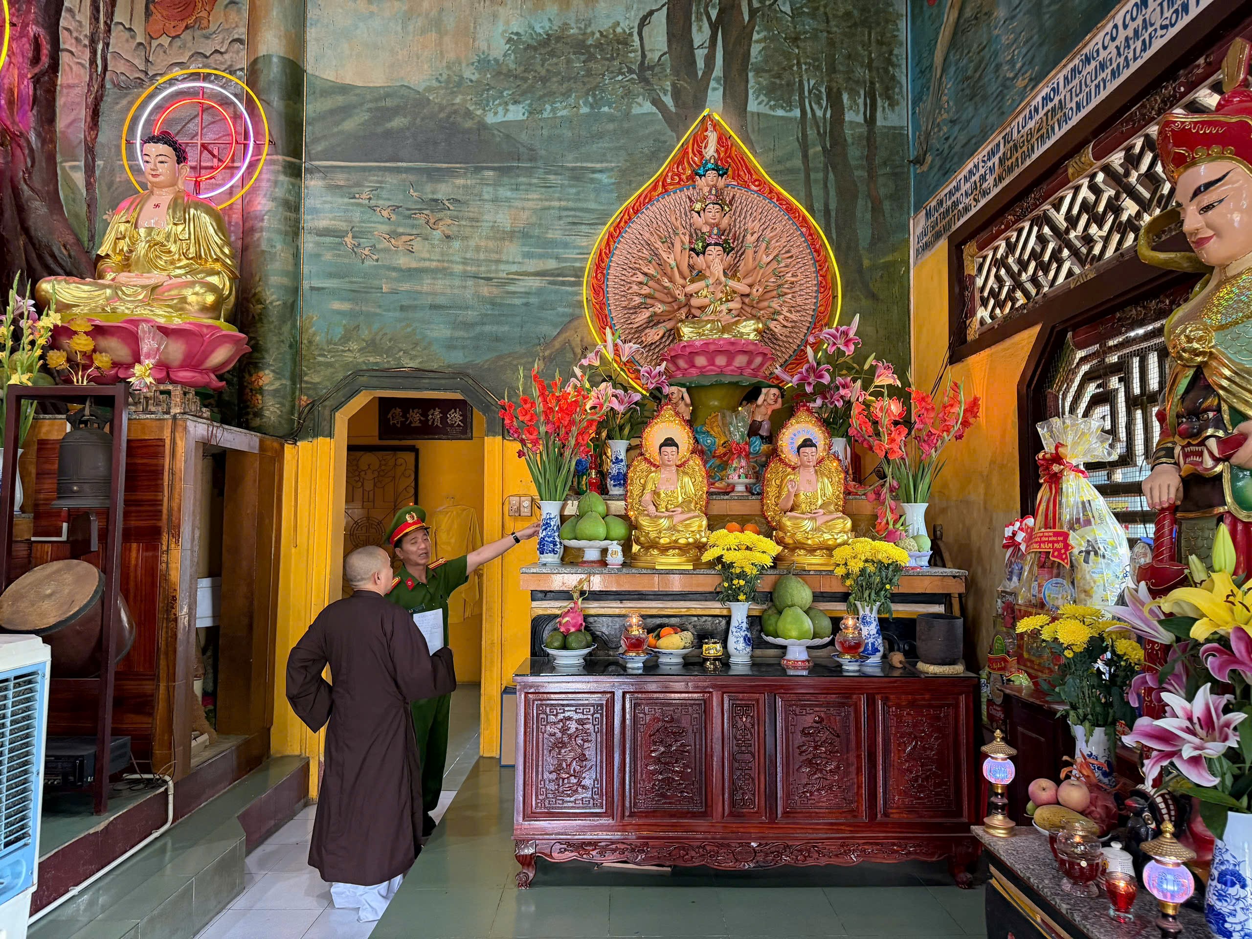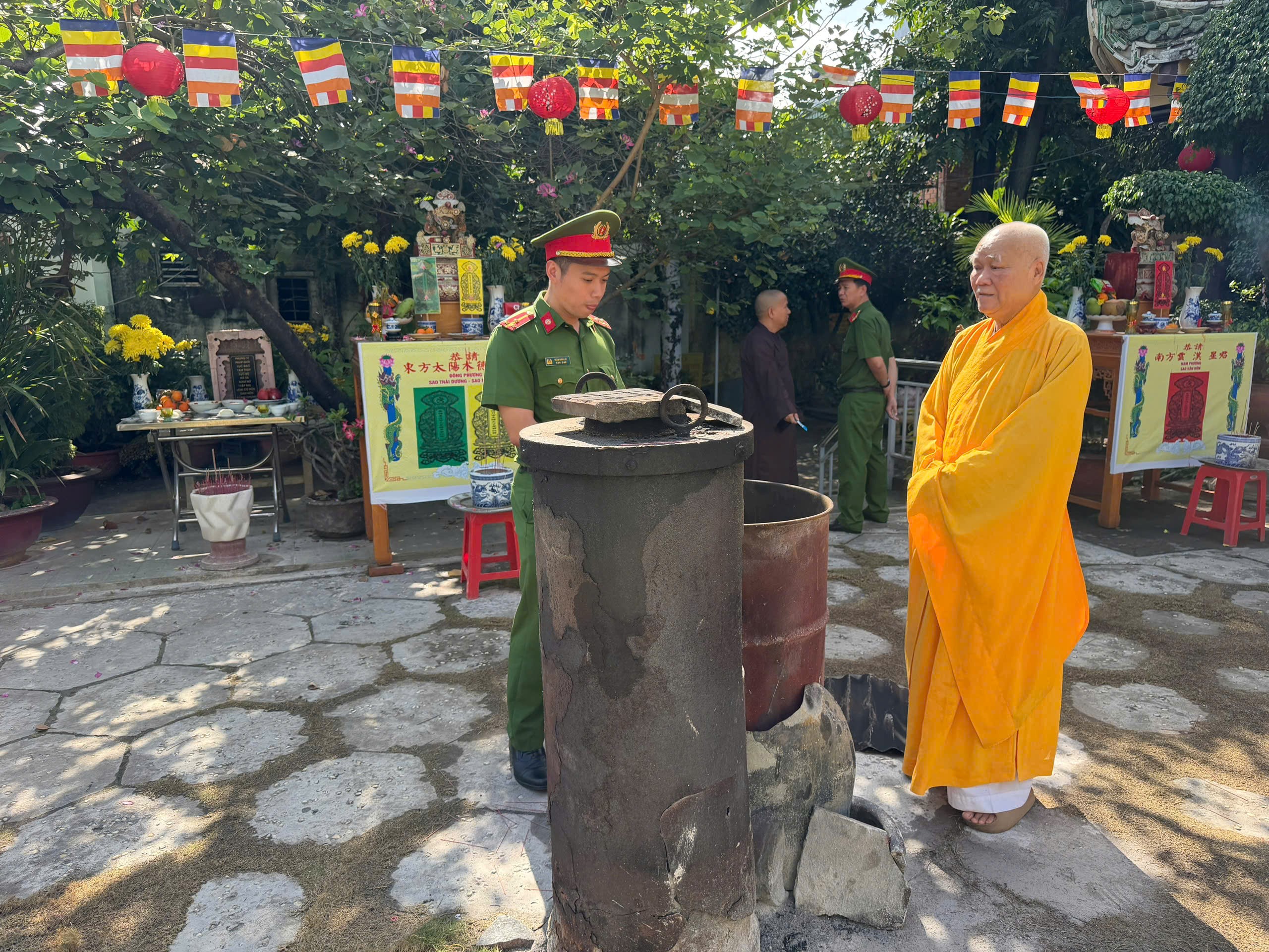 Đối với khu vực thắp nhang và đốt vàng mã, đoàn công tác hướng dẫn bố trí riêng biệt, có thùng kim loại hoặc lò đốt chuyên dụng, đặt xa khu vực chính điện và nơi tập trung đông người; thường xuyên có người trông coi trong suốt quá trình đốt. Tro, tàn nhang sau khi cháy phải được thu gom, xử lý triệt để, tránh để sót tàn lửa có thể gây cháy lan. Đồng thời, khuyến cáo ban quản lý tăng cường nhắc nhở phật tử không đốt vàng mã tràn lan, không mang các vật dụng dễ cháy vào khu vực thờ tự.