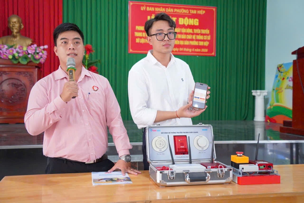 Đại diện Cty Gtel giới thiệu tính năng, tác dụng của hệ thống truyền tin báo cháy