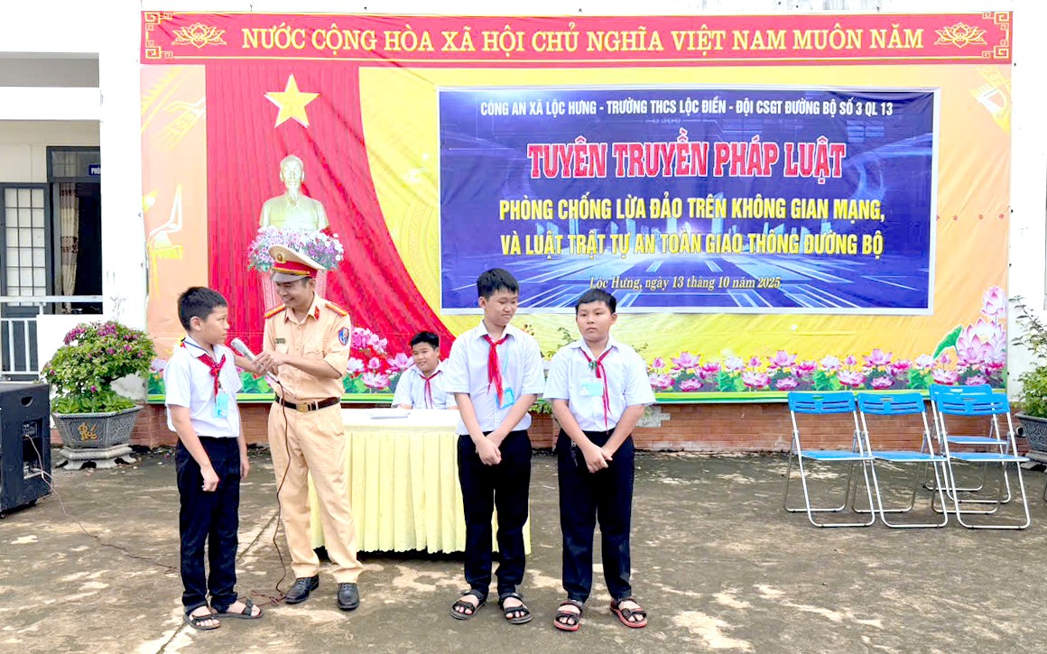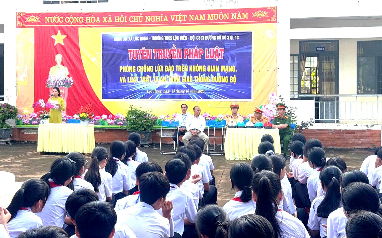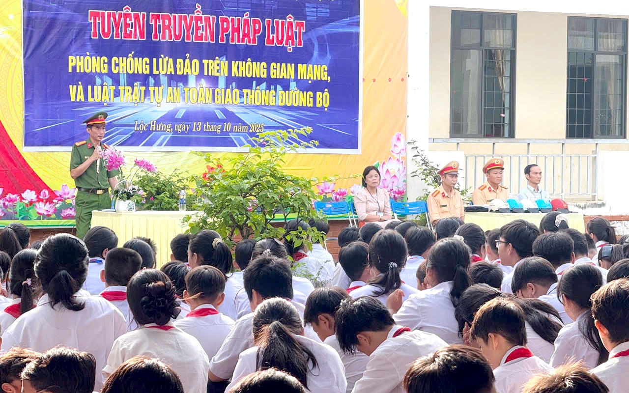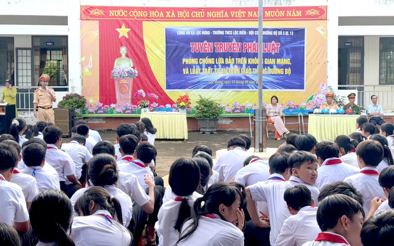 Sáng 13/10, Công an xã Lộc Hưng, tỉnh Đồng Nai đã phối hợp với Đội Cảnh sát giao thông (CSGT) số 3, Phòng CSGT Công an tỉnh, tổ chức tuyên truyền pháp luật cho hơn 1.200 em học sinh và giáo viên 02 trường Trung học cơ sở Lộc Điền và Trung học cơ sở Lộc Khánh.