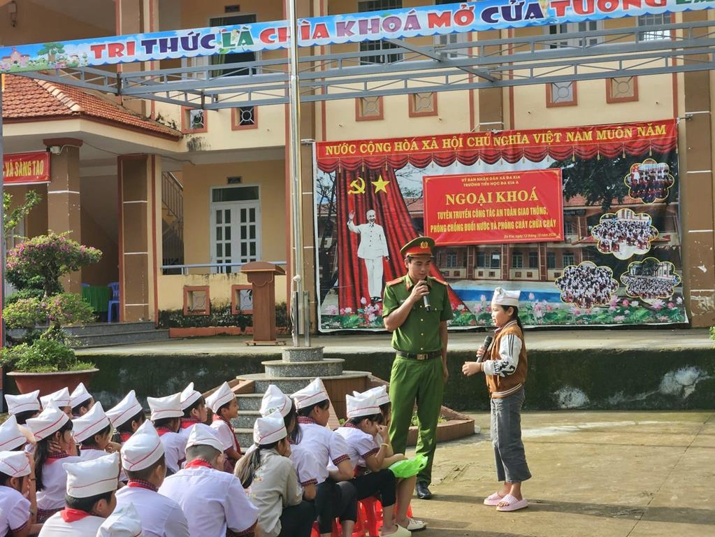 Bằng các hình thức tuyên truyền sinh động, dễ hiểu, phù hợp với lứa tuổi học sinh, cán bộ Công an xã đã chia sẻ, phổ biến một số nội dung trọng tâm của Luật Trật tự an toàn giao thông đường bộ, Luật Phòng cháy chữa cháy và cứu nạn, cứu hộ như: Độ tuổi điều khiển phương tiện tham gia giao thông, các kỹ năng tham gia giao thông an toàn,…; Các kỹ năng về phòng cháy chữa cháy, cách xử trí khi có sự cố cháy, nổ xảy ra.