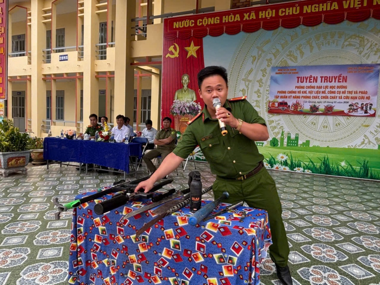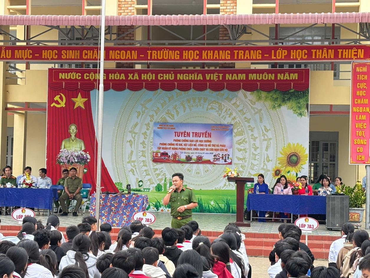 Tại buổi tuyên truyền, cán bộ Công an xã Lộc Quang đã tuyên truyền, phổ biến, giáo dục pháp luật với nhiều nội dung thiết thực, trọng tâm, dễ hiểu, tập trung vào các vấn đề đang được xã hội quan tâm trong môi trường giáo dục hiện nay như: Nhận thức và cách thức phòng tránh bạo lực học đường; Luật và kỹ năng phòng cháy chữa cháy và cứu nạn cứu hộ; Luật quản lý sử dụng vũ khí, vật liệu nổ và công cụ hỗ trợ; Tác hại và phòng, chống pháo nổ; Nhận thức và phòng tránh tệ nạn ma túy…