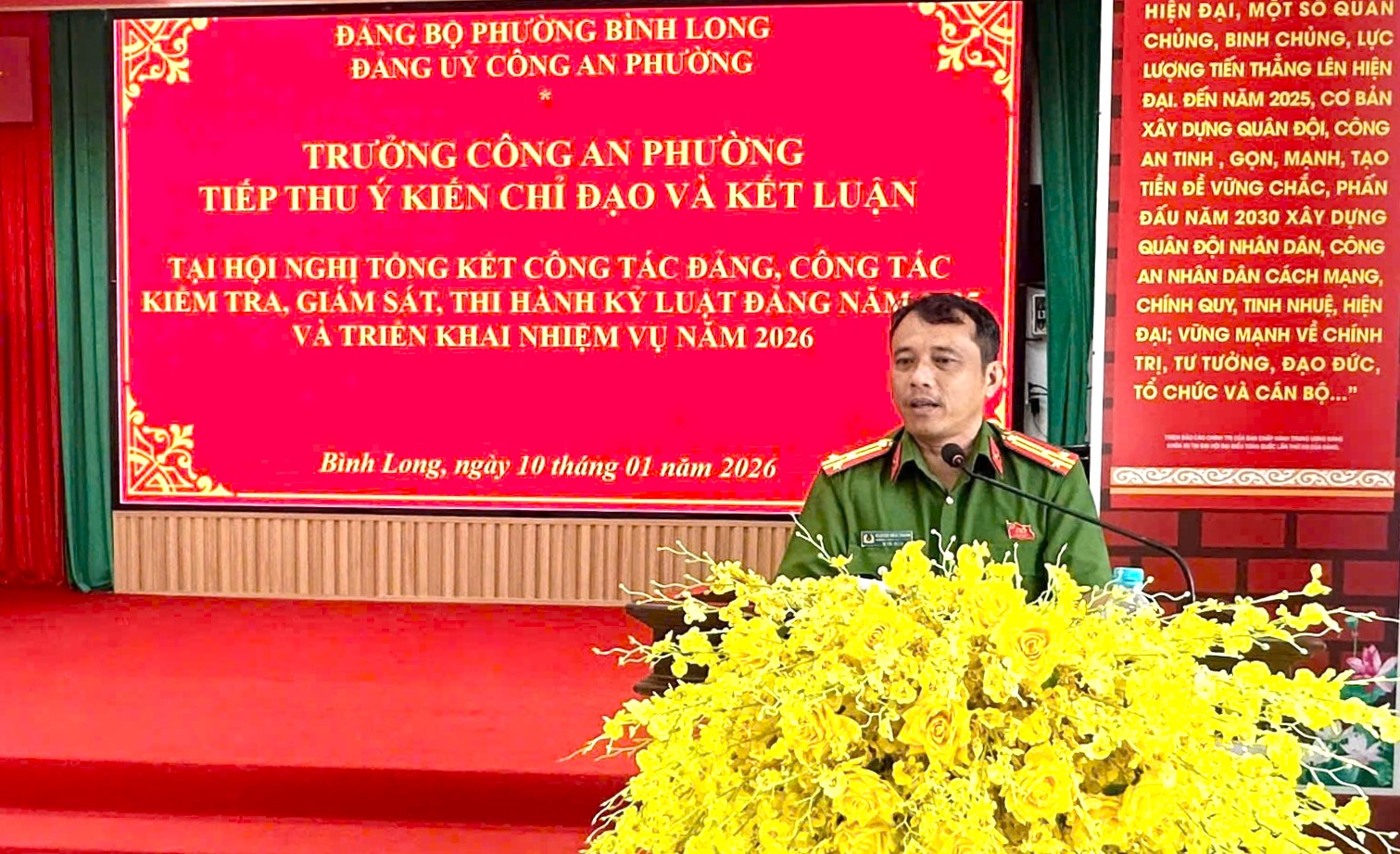 Kết luận Hội nghị, đồng chí Thượng tá Nguyễn Hoài Thanh nhấn mạnh: bước sang năm 2026 - năm diễn ra nhiều sự kiện chính trị quan trọng, Đảng uỷ Công an phường Bình Long cần tiếp tục nâng cao năng lực lãnh đạo, sức chiến đấu của tổ chức Đảng; tăng cường công tác giáo dục chính trị tư tưởng; nâng cao chất lượng sinh hoạt chi bộ; đẩy mạnh công tác kiểm tra, giám sát; xây dựng đội ngũ cán bộ, đảng viên bản lĩnh, trách nhiệm, gần dân, sát dân; chủ động nắm chắc tình hình, bảo đảm tốt an ninh, trật tự tại cơ sở; phục vụ hiệu quả các nhiệm vụ chính trị của địa phương.