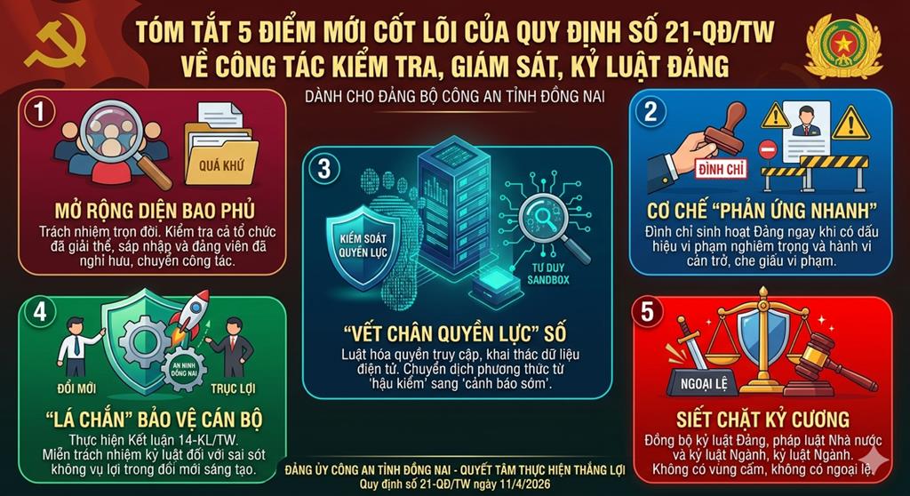 “Không gian số” - Mặt trận kiểm tra mới. Lần đầu tiên, chính thức cụ thể hóa việc giám sát trên môi trường điện tử. Đây là yêu cầu bắt buộc trong tiến trình chuyển đổi số của ngành Công an. Mọi “vết chân quyền lực” trên các hệ thống dữ liệu điện tử, các phát ngôn và hành vi trên không gian mạng của đảng viên đều nằm trong phạm vi giám sát của Đảng. Điều này đòi hỏi mỗi đảng viên Công an Đồng Nai phải giữ gìn hình ảnh, tác phong chuẩn mực không chỉ ngoài đời thực mà còn trên môi trường số.