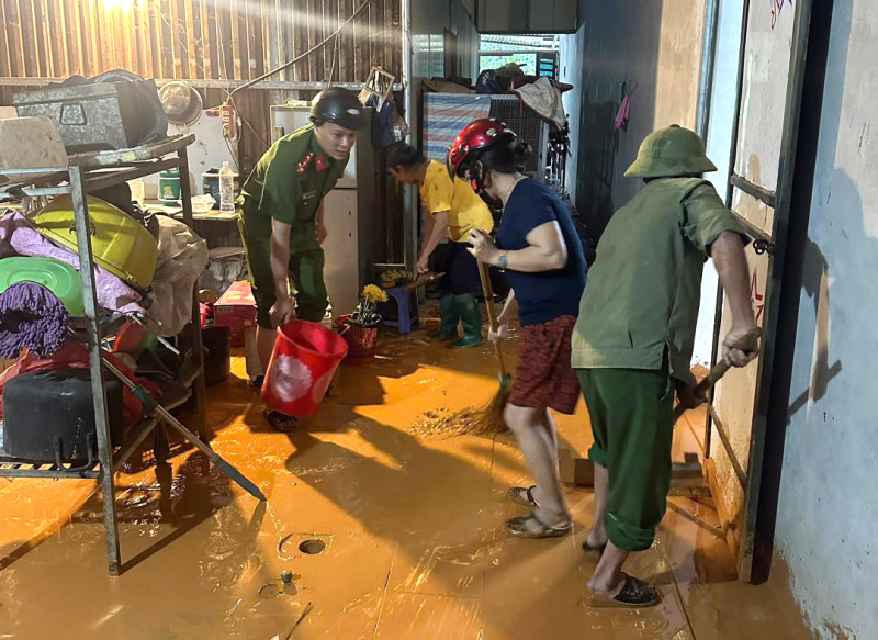 Lực lượng Công an tỉnh giúp người dân dọn dẹp nhà cửa, sớm ổn định đời sống sau thiên tai.